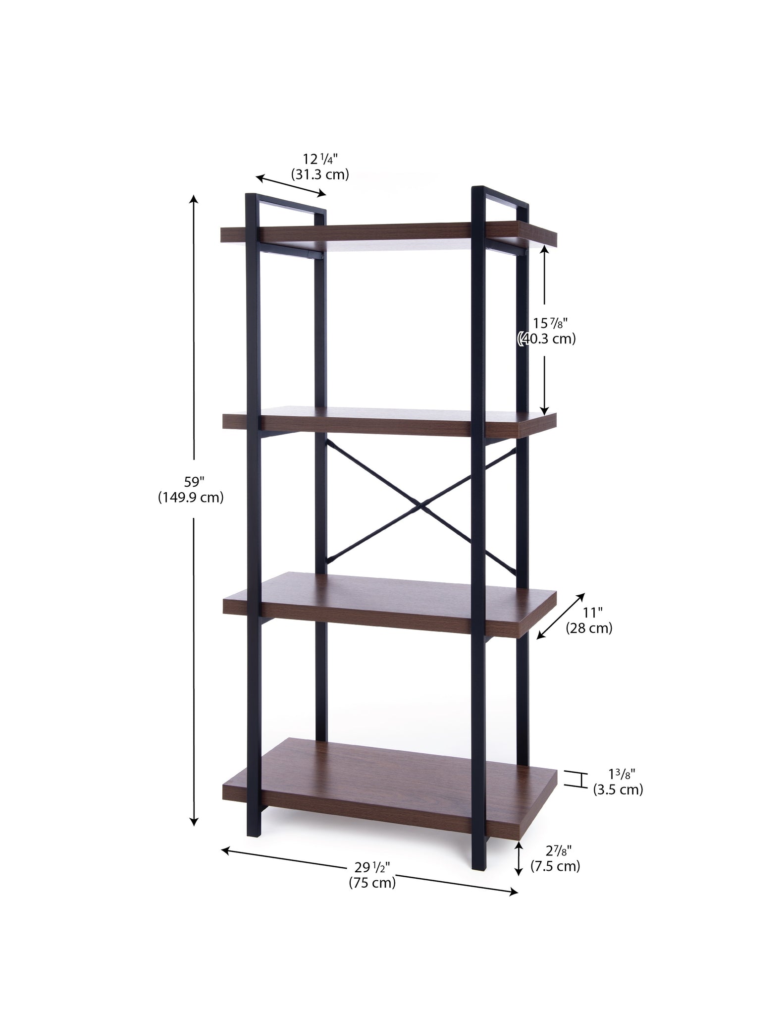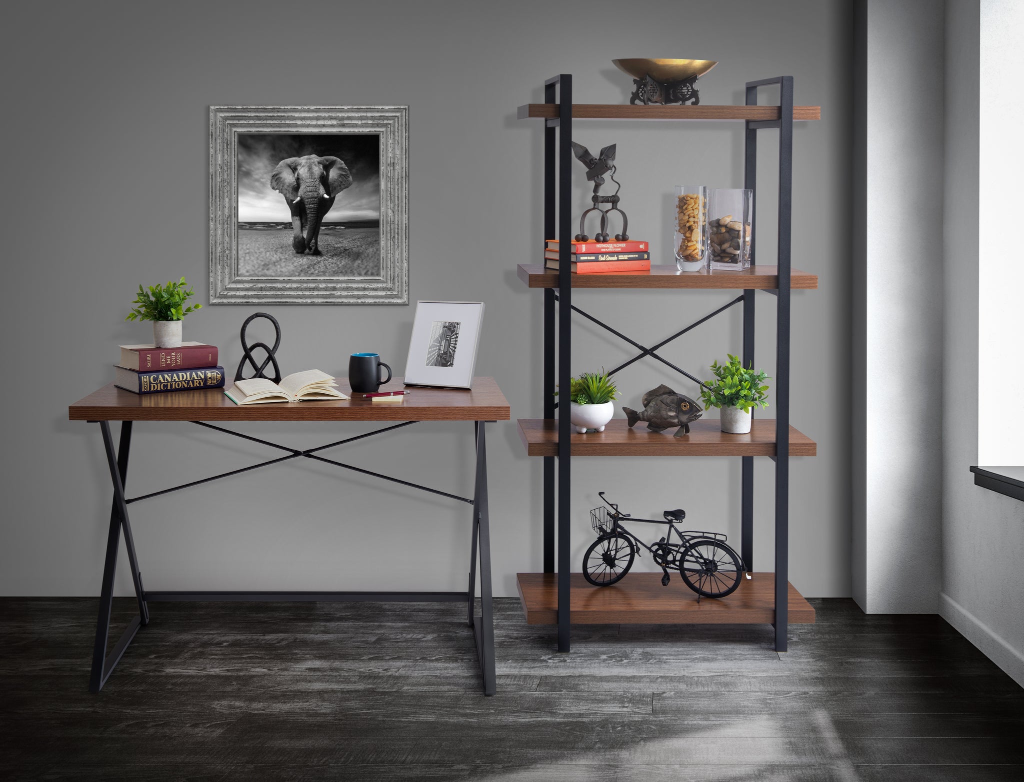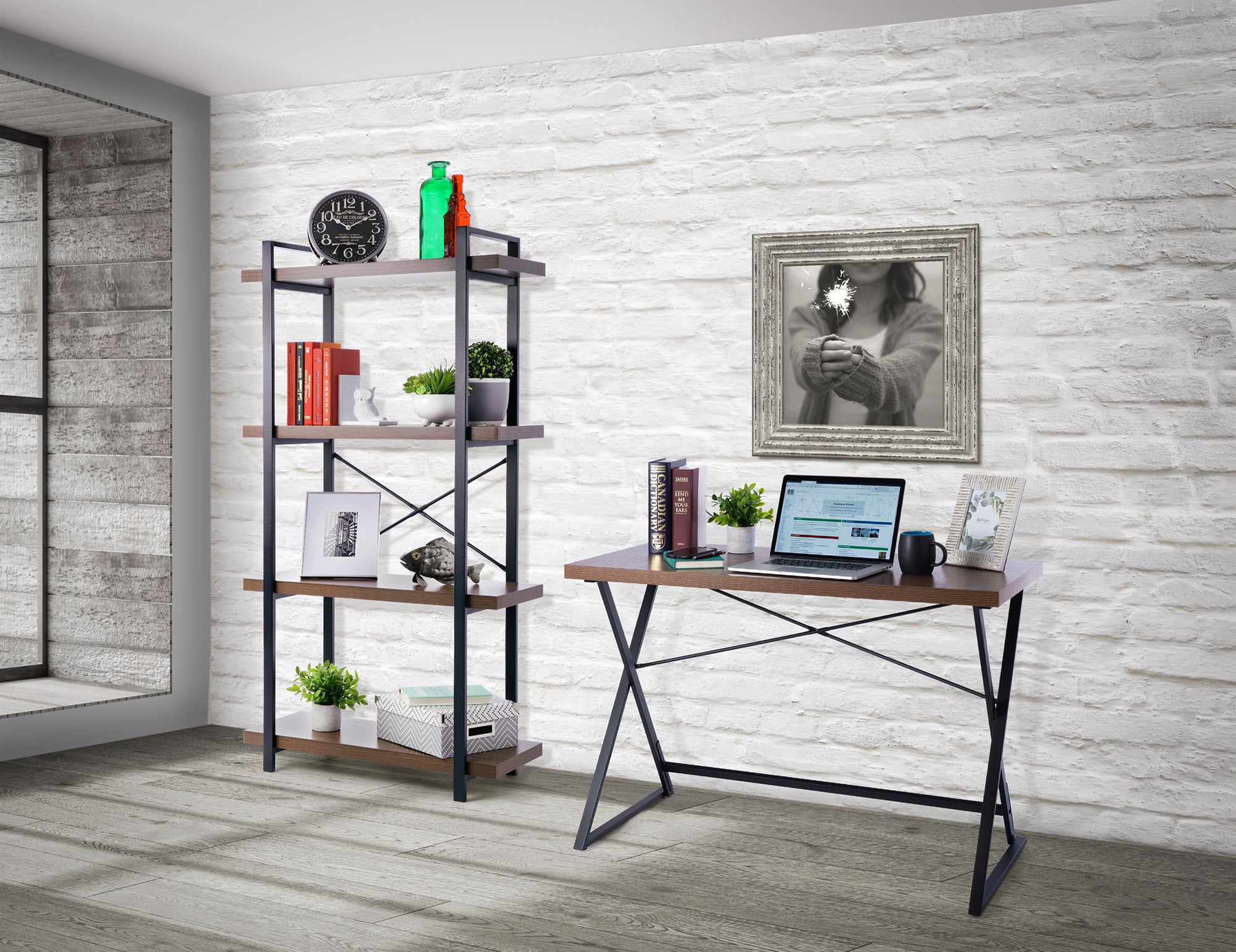 Etagere bookcase with wood shelves and the metal frame is designed in the industrial-chic style. The shelf size provides the perfect amount of spaces to display many keepsakes, books, vases, and the like. The piece features easy-care melamine laminate surfaces and durable powder-coated metal frame construction. This bookcase matches 21 Story desk shown on the picture. Includes clear and brief assembly instructions.