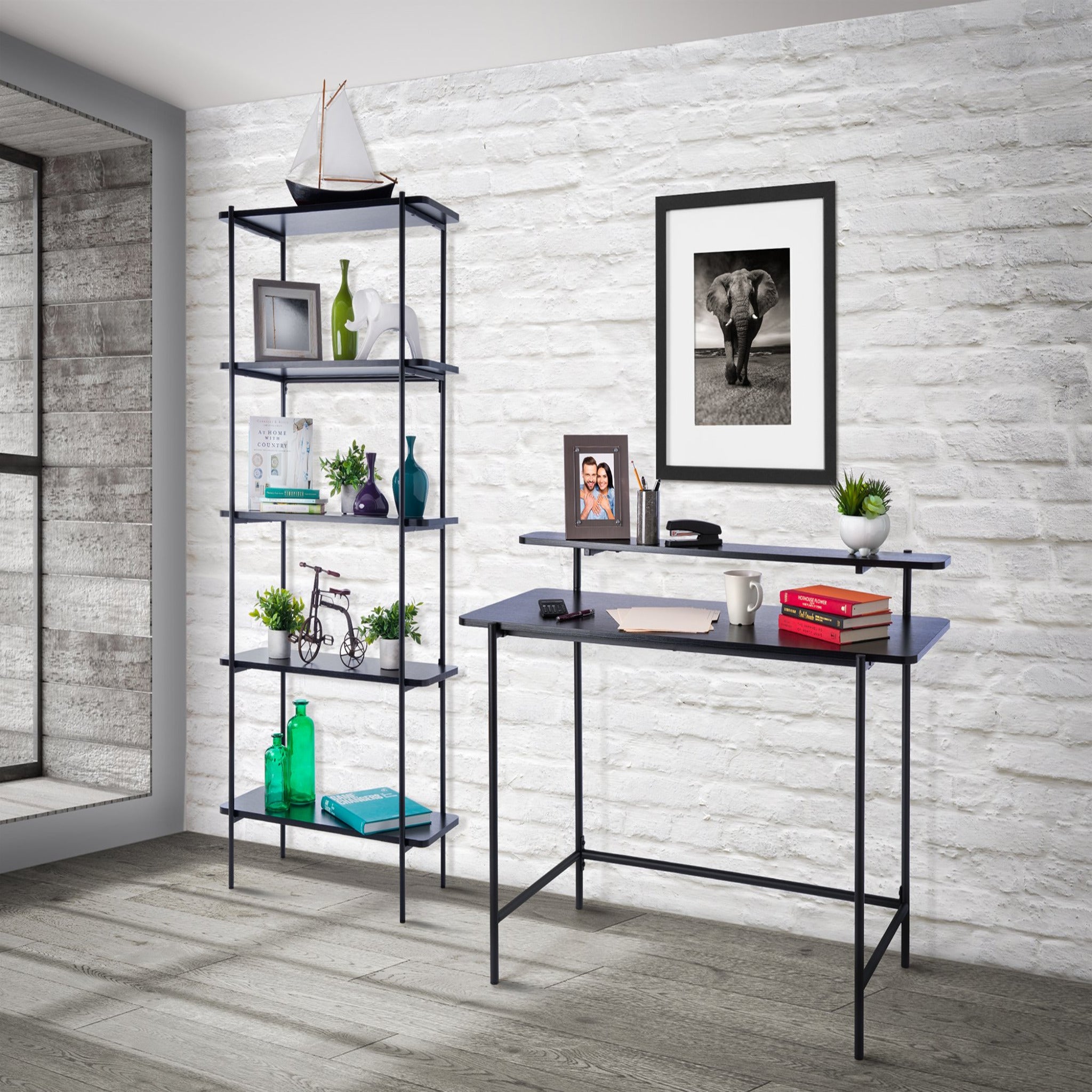 Etagere Bookcase with wood shelves and metal frame is designed in the contemporary style. The shelf size provides the perfect amount of spaces to display many keepsakes, books, vases and the like. The piece features easy care melamine laminate surfaces and durable powder coated metal frame construction. This bookcase match with Modernatta Desk shown on picture. Includes clear and brief assembly instructions.