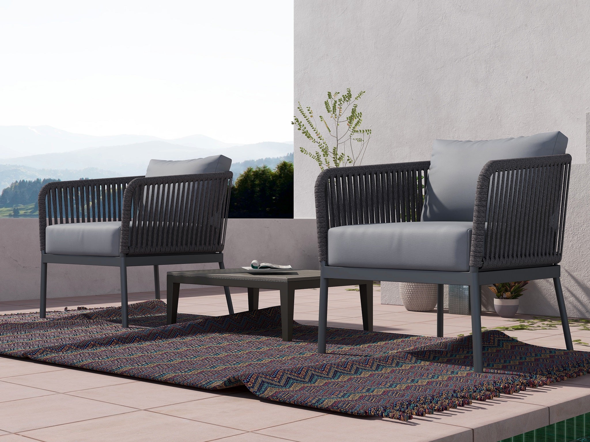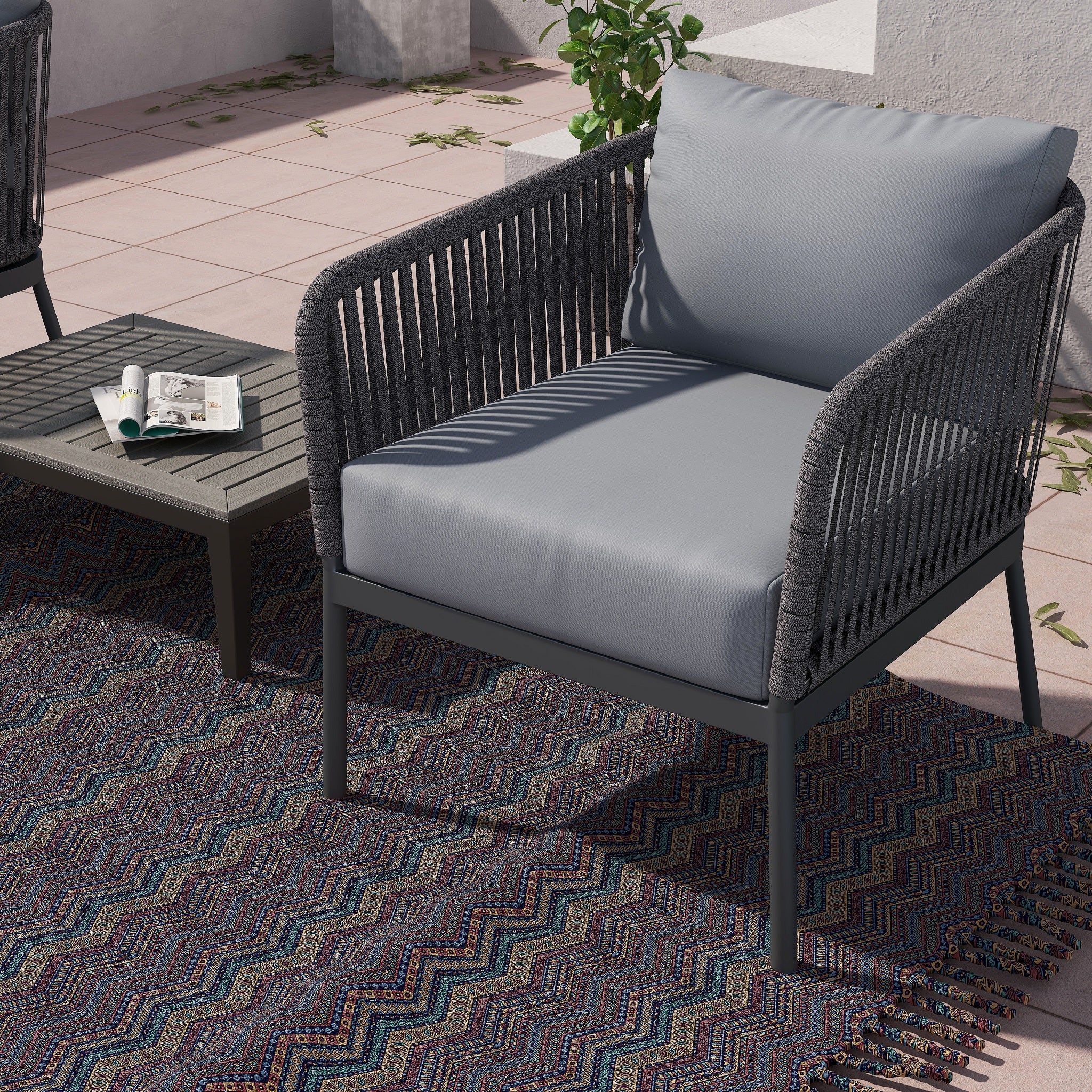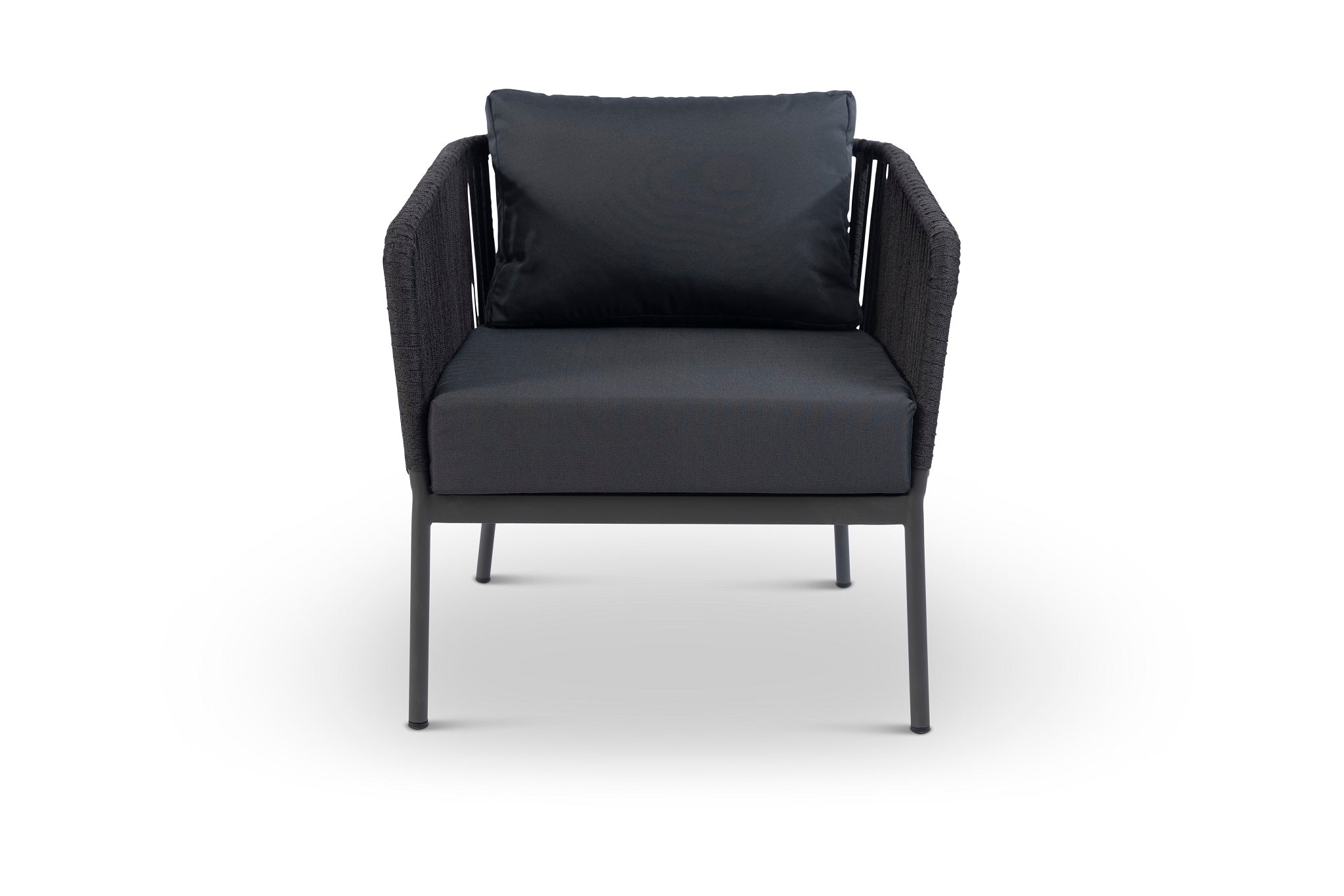 RopeVibe Patio Club Armchair with cushions are made from an attractive blend of materials aluminum and woven cord. RopeVibe line is setting new standards for multi flexible design and elegant, transparent and minimalistic design. Extremely comfortable and hard-wearing. These outdoor dining chairs beautifully transform any backyard, patio, balcony or terrace into an elegant outdoor dining area. Features superior quality woven rope. Include back rectangular cushion, and 12cm soft water-resistant seat cushions made from 100% Polyester Golden Peacock Outdoor Fabric Grade 3 (Weight: 248g/m2) for effortless relaxation throughout the summer season. With a sturdy frame, and beautiful design, this chair will have no problem blending into your outdoor decor with its modern style and incredible durability. It is easy to clean and no assembly is required.