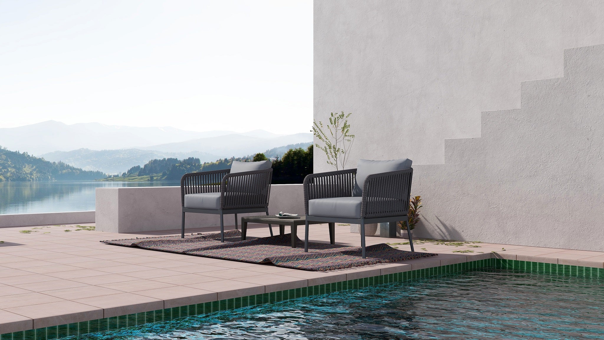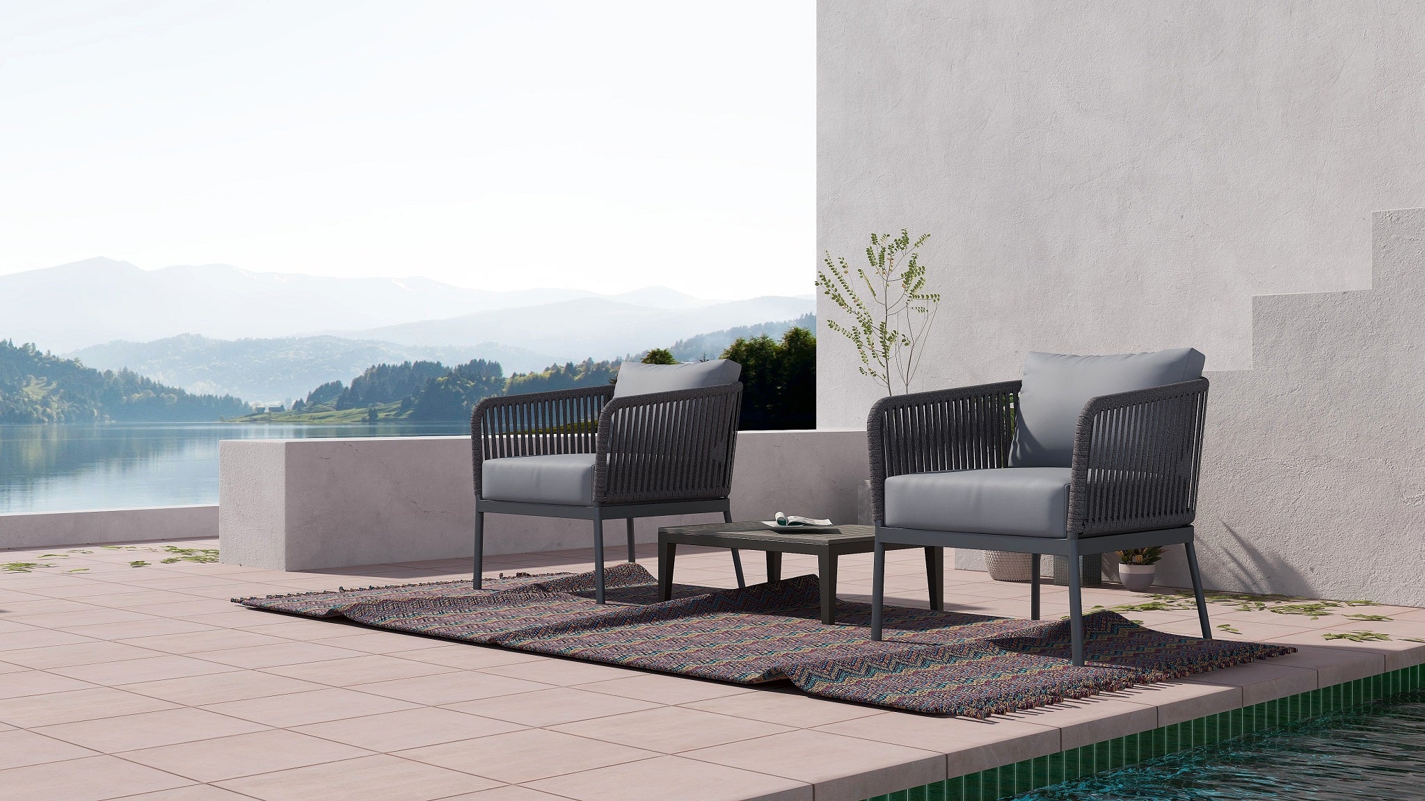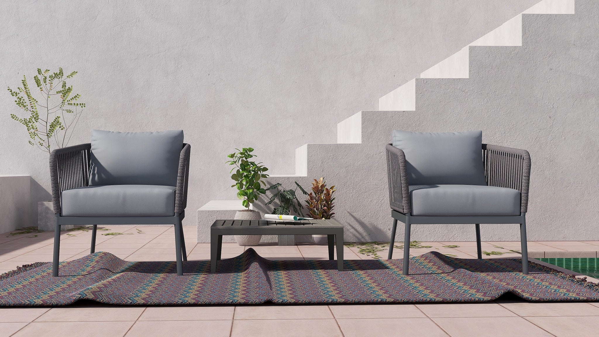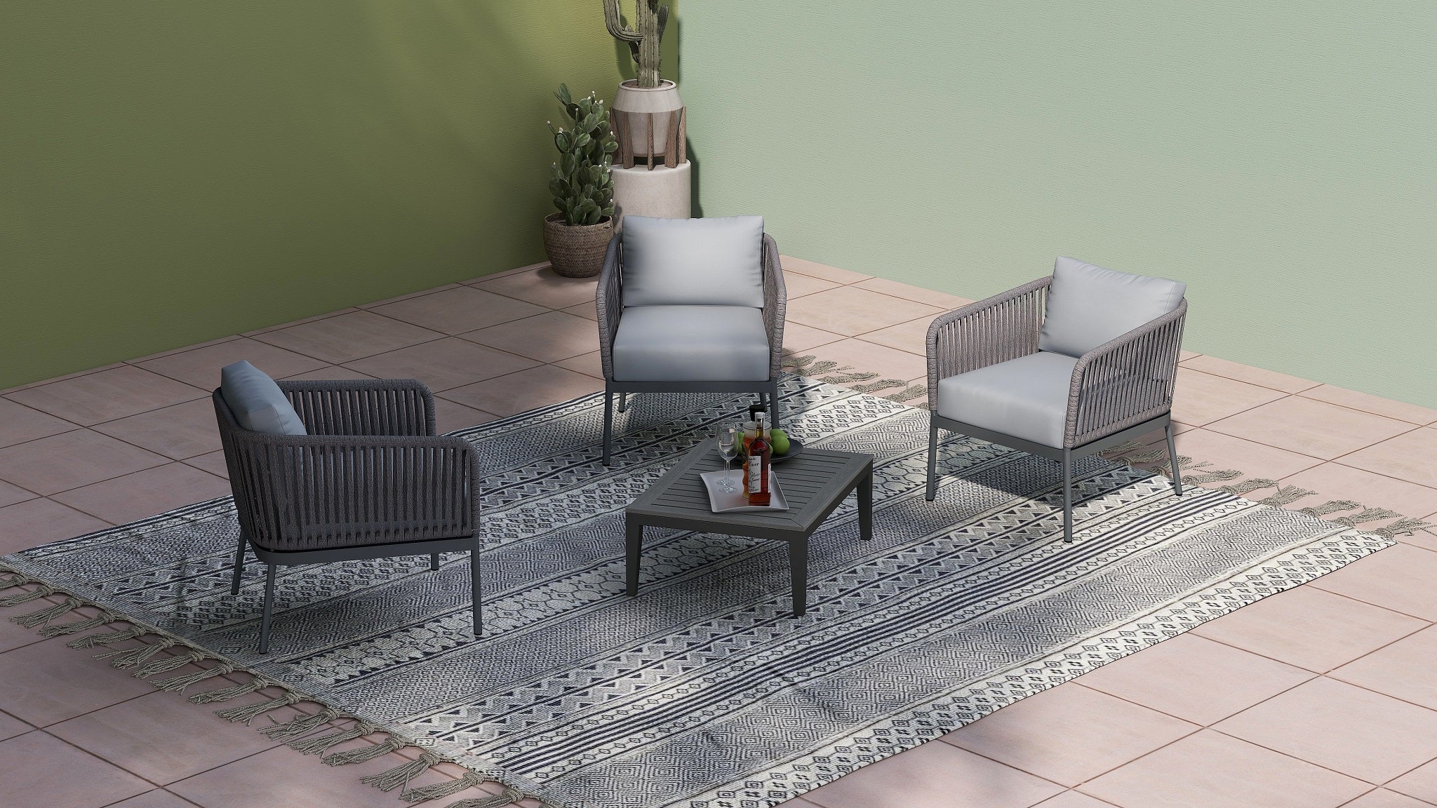 RopeVibe Patio Club Armchair with cushions are made from an attractive blend of materials aluminum and woven cord. RopeVibe line is setting new standards for multi flexible design and elegant, transparent and minimalistic design. Extremely comfortable and hard-wearing. These outdoor dining chairs beautifully transform any backyard, patio, balcony or terrace into an elegant outdoor dining area. Features superior quality woven rope. Include back rectangular cushion, and 12cm soft water-resistant seat cushions made from 100% Polyester Golden Peacock Outdoor Fabric Grade 3 (Weight: 248g/m2) for effortless relaxation throughout the summer season. With a sturdy frame, and beautiful design, this chair will have no problem blending into your outdoor decor with its modern style and incredible durability. It is easy to clean and no assembly is required.