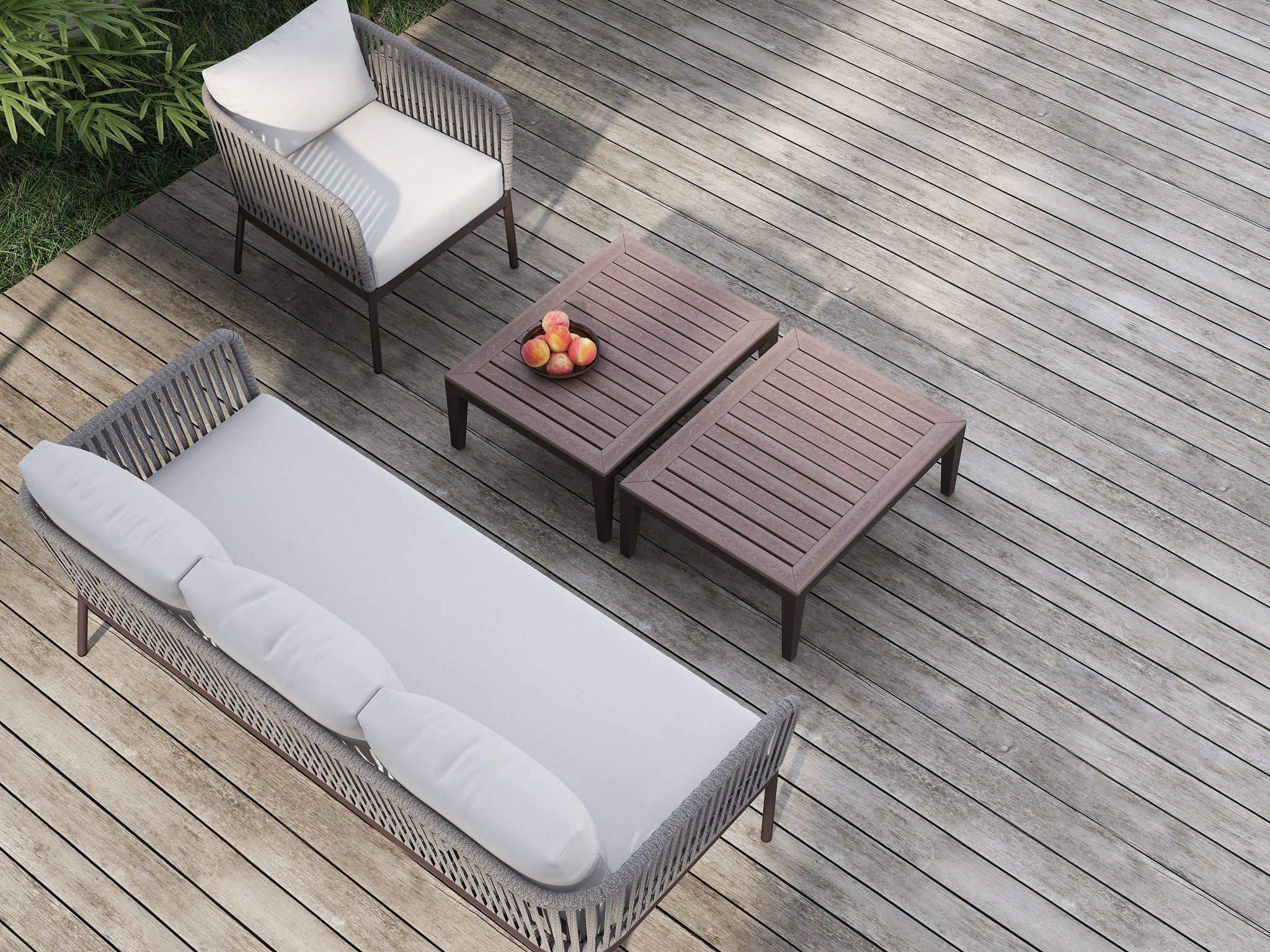 RopeVibe Patio Conversational Set with cushions are made from an attractive blend of materials aluminum and woven cord. RopeVibe line is setting new standards for multi flexible design and elegant, transparent and minimalistic design. Extremely comfortable and hard-wearing. These outdoor dining chairs beautifully transform any backyard, patio, balcony or terrace into an elegant outdoor dining area. Features superior quality woven rope. Include back rectangular cushion, and 5cm soft water-resistant seat cushions made from 100% Polyester Golden Peacock Outdoor Fabric Grade 3 (Weight: 248g/m2) for effortless relaxation throughout the summer season. With a sturdy frame, and beautiful design, this chair will have no problem blending into your outdoor decor with its modern style and incredible durability. It is easy to clean and no assembly is required.